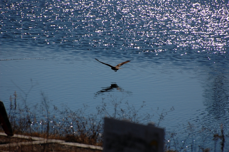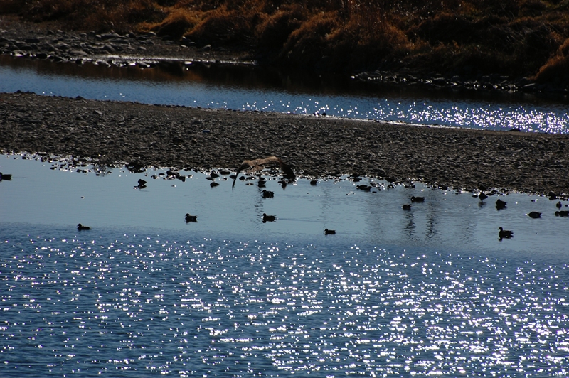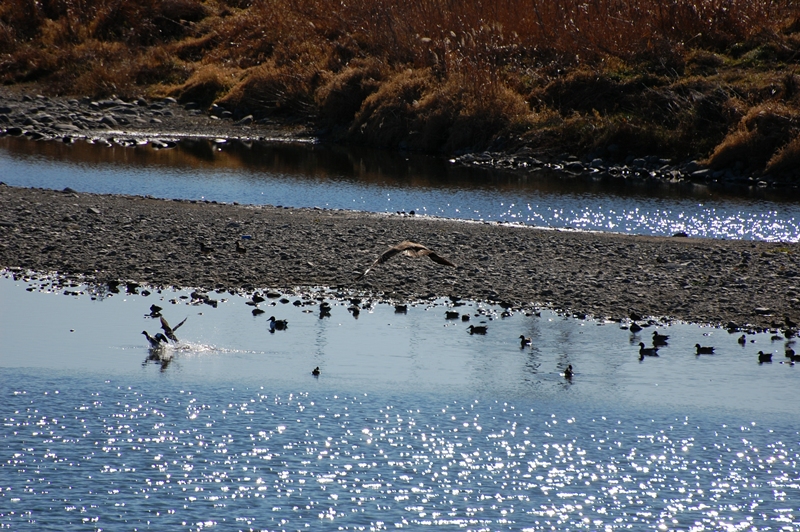 水面にプカプカ浮かんでる鴨のすぐ上を優雅に飛んでます。